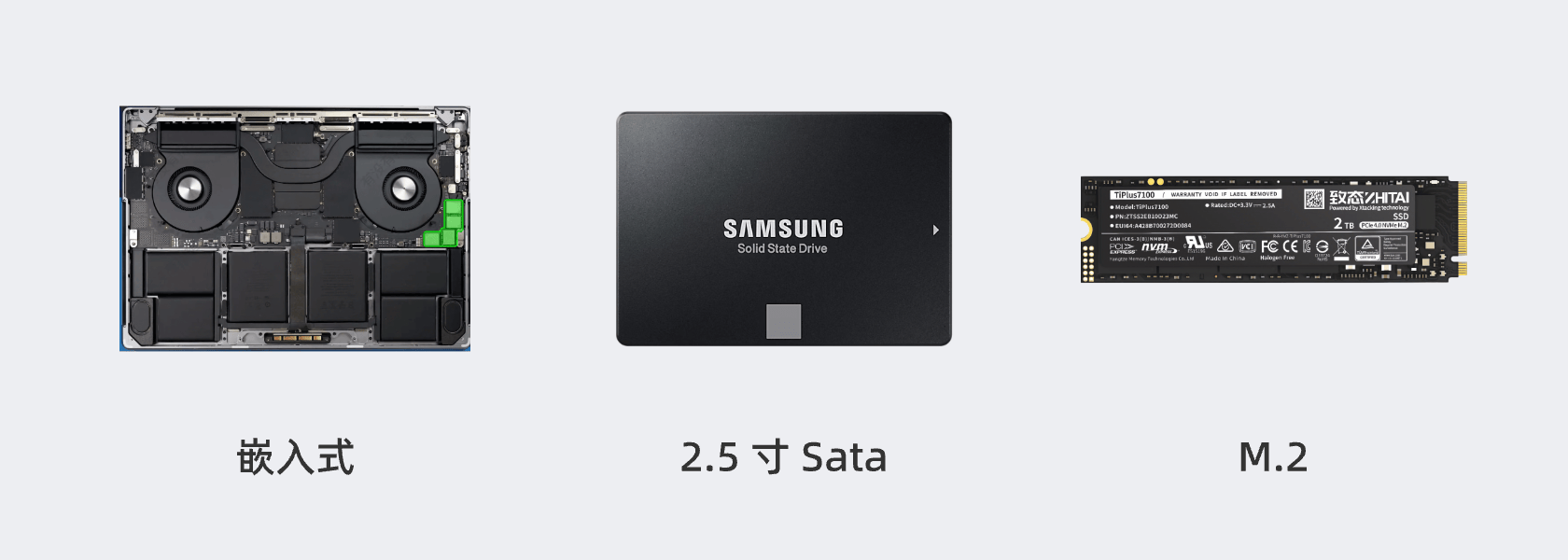 固态硬盘是个大类,具体的产品形式也有很多种,最常见的类型包含嵌入式(焊死在主板上)和可插拔的2.5寸sata 接口硬盘、M.2接口硬盘三种。