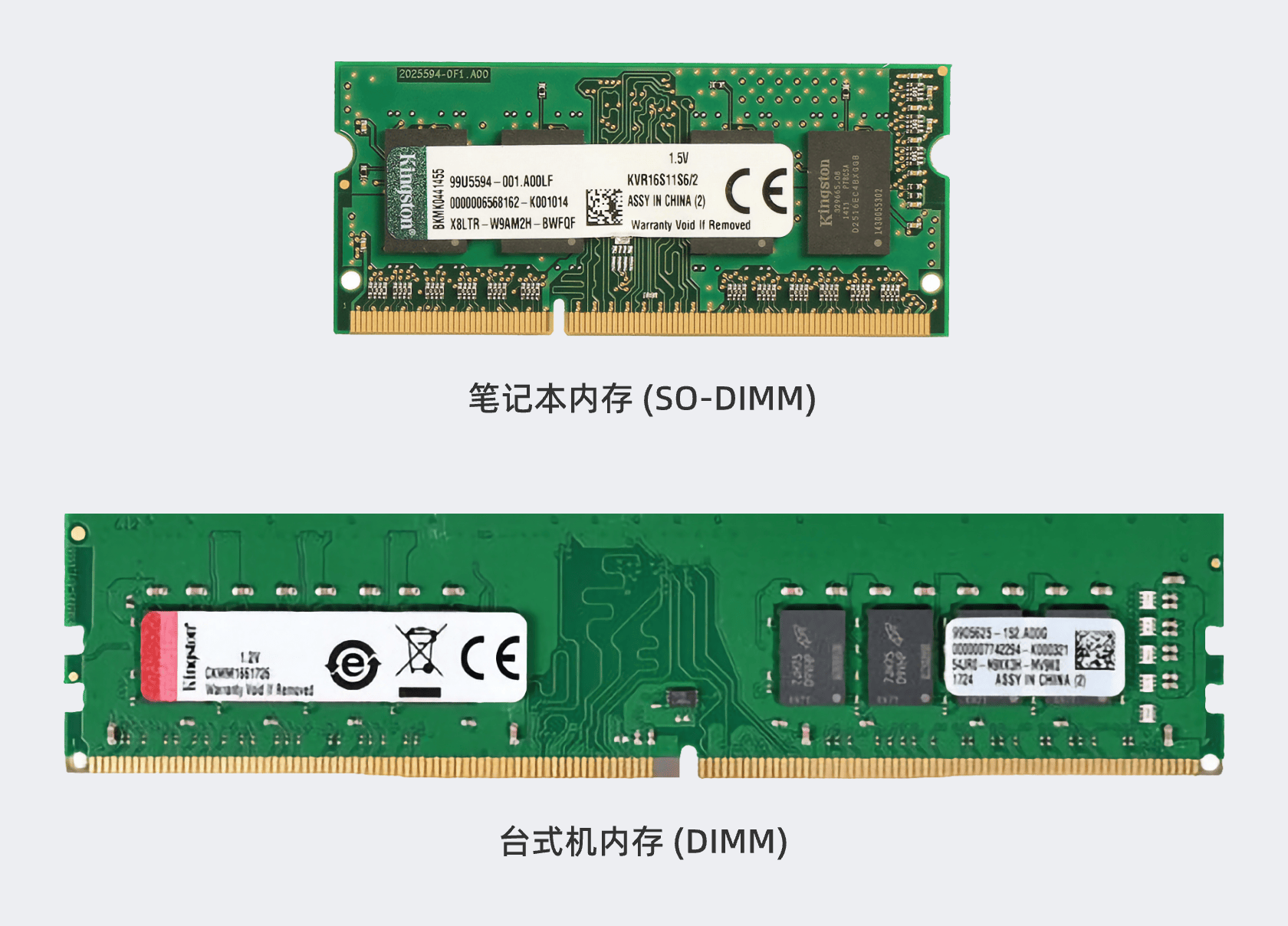 内存在尺寸的规格上包含两种,一种用于笔记本、一体机的小尺寸规格 SO-DIMM(Small Outline DIMM),另一种是应用于台式机、服务器的DIMM(Dual Inline Memory Module)。