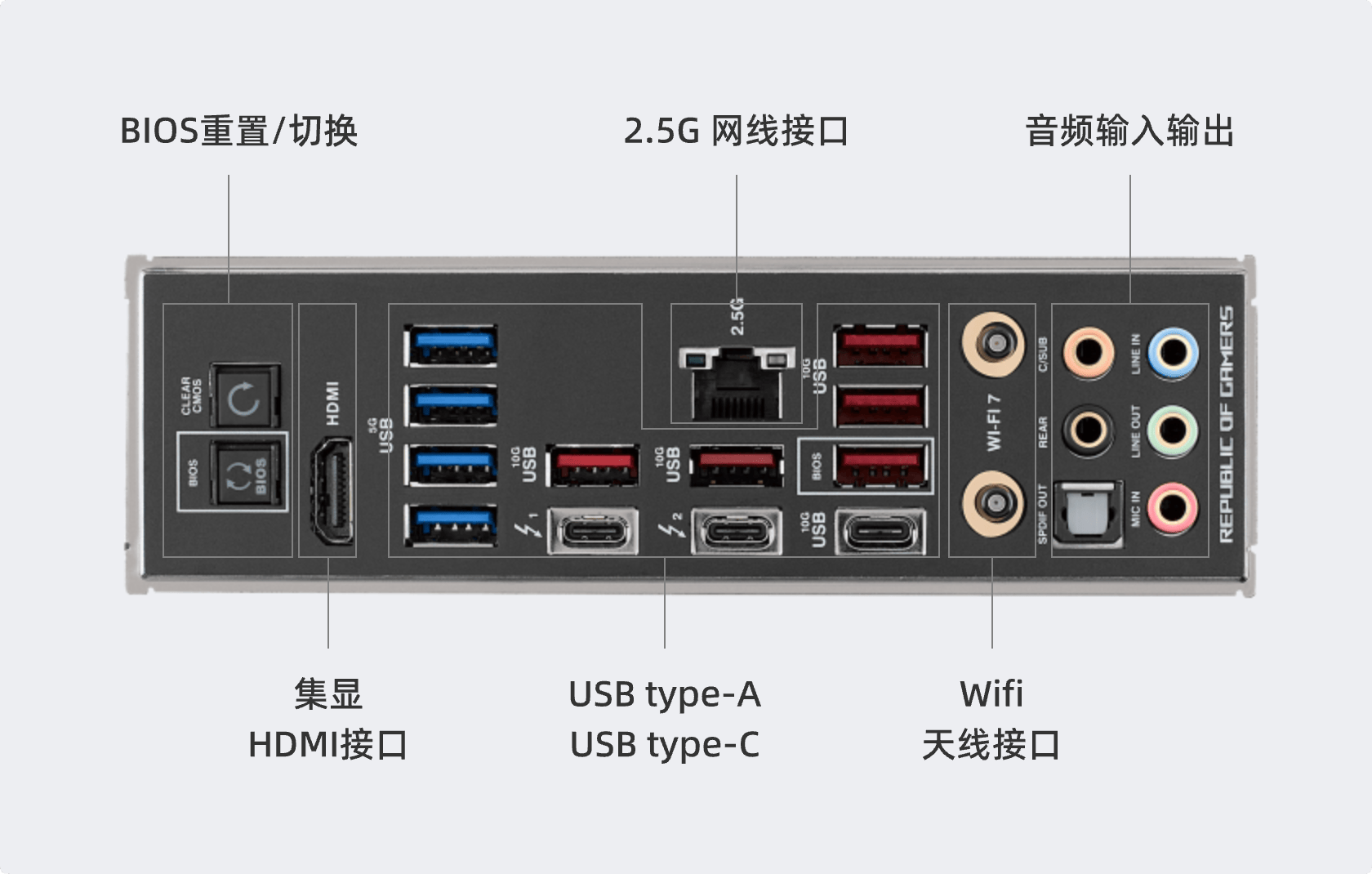 - 视频输出接口:主要是 HDMI、DP、USB-C 的接口类型和数量,以及对应接口输出的最大分辨率;主板 I/O 中的视频口为集成显卡的输出口,独立显卡的视频口在显卡本体上。