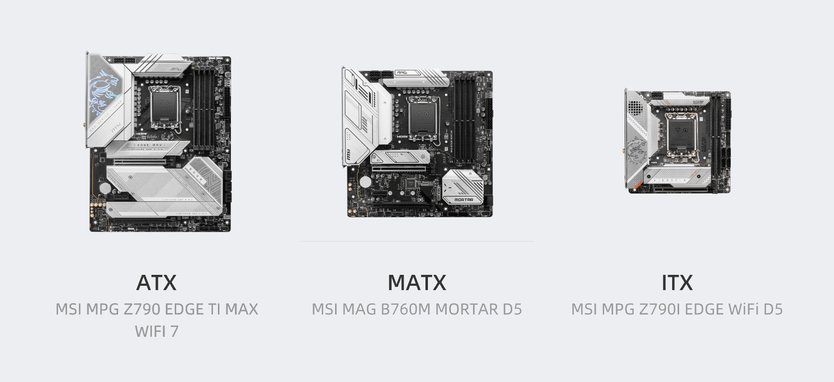 除了芯片、等级,主板还有尺寸上的差异,用于不同尺寸的机箱,主流的尺寸类型包含: