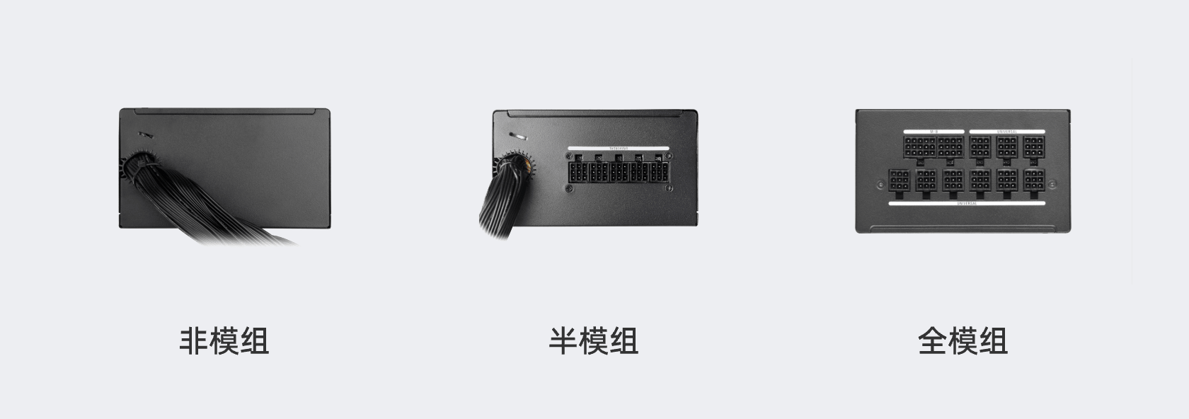 - 模块化:非模组、半模组、全模组,指的是电源输出的线是否可拆卸,非模组电源背部的连接线全部不可拆卸,用不到的只能卷在机箱内;全模组则是全部可拆卸;半模组是只有 CPU、主板、GPU 这些必要部件的电源线不可拆卸,其余可拆卸。