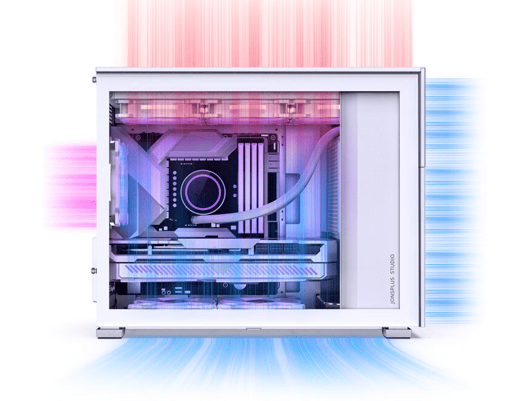 机箱散热需要考虑风道的问题,因为风扇是将空气从一侧抽取到另一侧吹出去,所以多个不同朝向的风扇难免会打架,对着吹就无法起到正常的引流作用了,所以在做散热时,宏观上需要保证一个原则:下进上出、前进后出。