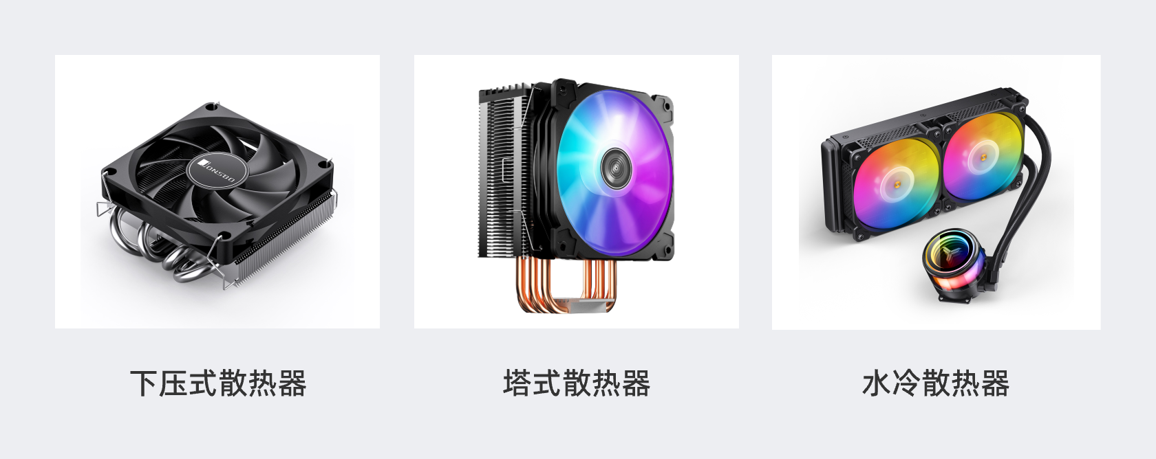 CPU 的散热器有三种形式:下压散热、塔式散热和水冷散热。下压散热和塔式散热属于风冷,热量主要由金属和空气传导;水冷散热则使用了专门的水冷液,CPU 的热量由液体相变传导至鳍片处。