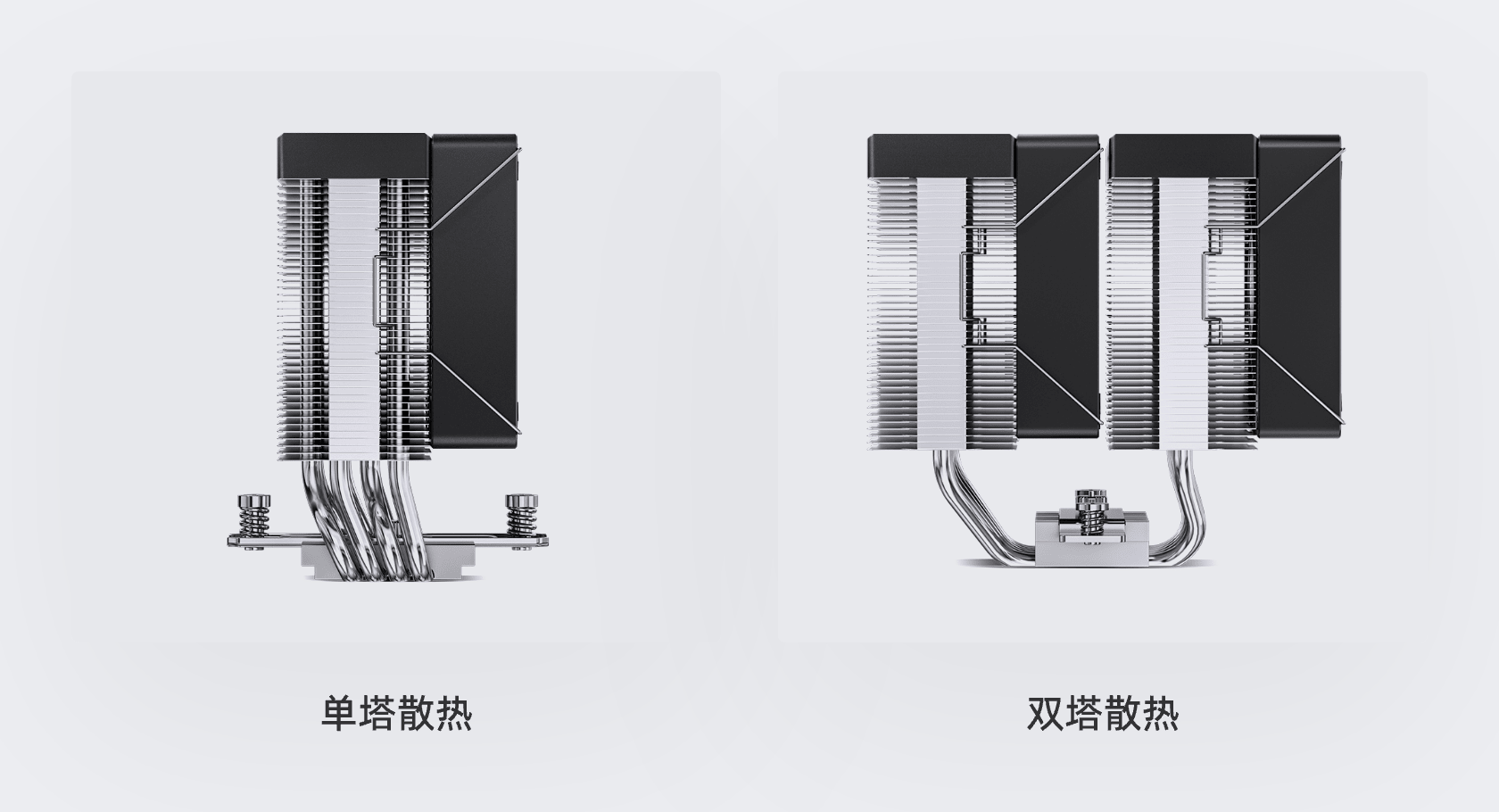 - 鳍片面积:鳍片的等效面积越大,越容易让热量被空气带走。由于塔式散热器的高度被机箱限制,所以鳍片面积主要通过增加塔的数量来提升,所谓单塔散热器和双塔散热器就是这个区别。