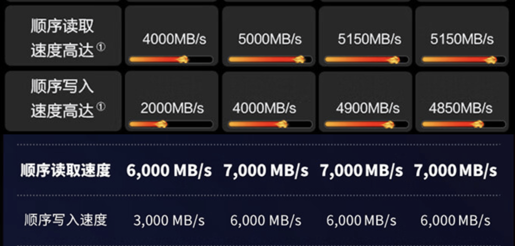 - M.2:M.2只是个单纯的接口,但可以使用 PCIE通道,所以在老设备 PCIE 3.0中,最大的传输速度为 3.94GB/s,在新的 PCIE 4.0中可以达到 7.88GB/s。