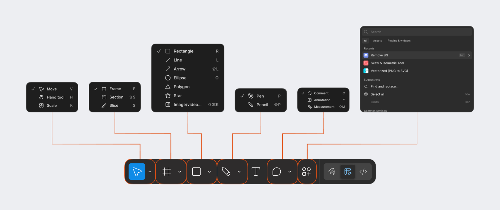 - 底部的工具栏:设计过程中会使用到的常用操作工具