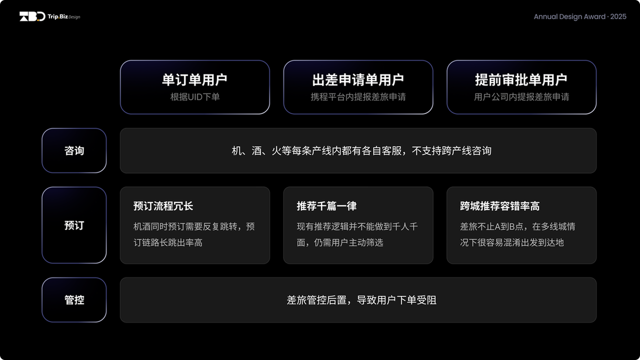 根据商旅独有的业务属性,我们将用户分为三大类型:单订单用户、出差申请单用户以及提前审批单用户,在咨询时三类用户的痛点高度一致,机酒火每条产线内都有各自的客服,但却不支持跨产线服务,导致体验断层;而在预订流程中单订单用户的反馈主要集中在预订流程冗长不能机酒同时预订;出差申请单用户会更希望有“懂我”的推荐,而非千篇一律;对于提前审批单用户来说,他们的痛点在于在多城市出差中没有一个明确的行程规划,导致系统推荐的出发到达地准确性过低。