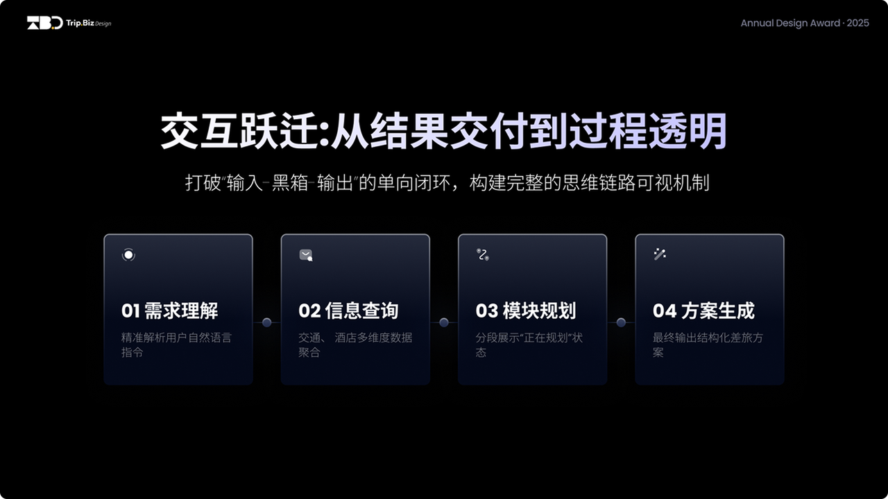 从功能交互视角,现在大部分的AI 工具的交互,流程大约都是输入指令→纯文字思考过程刷屏→被动等结果的单向闭环:滚动的文字是看不见逻辑的 “思考黑箱”,你只能在未知中盲目等待,我们希望用户可清晰感知 AI 的思考逻辑,所以在设计的过程中,我们将用户指令的执行过程拆解为 “需求理解 – 信息查询 – 模块规划 – 方案生成” 的完整链路