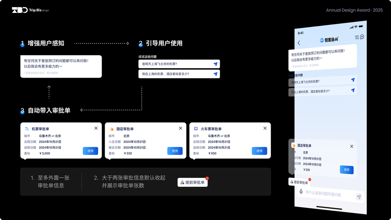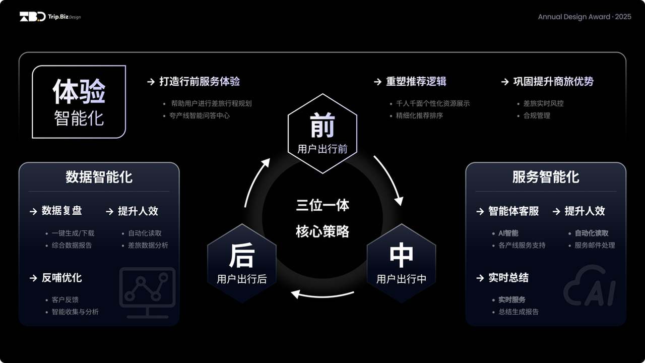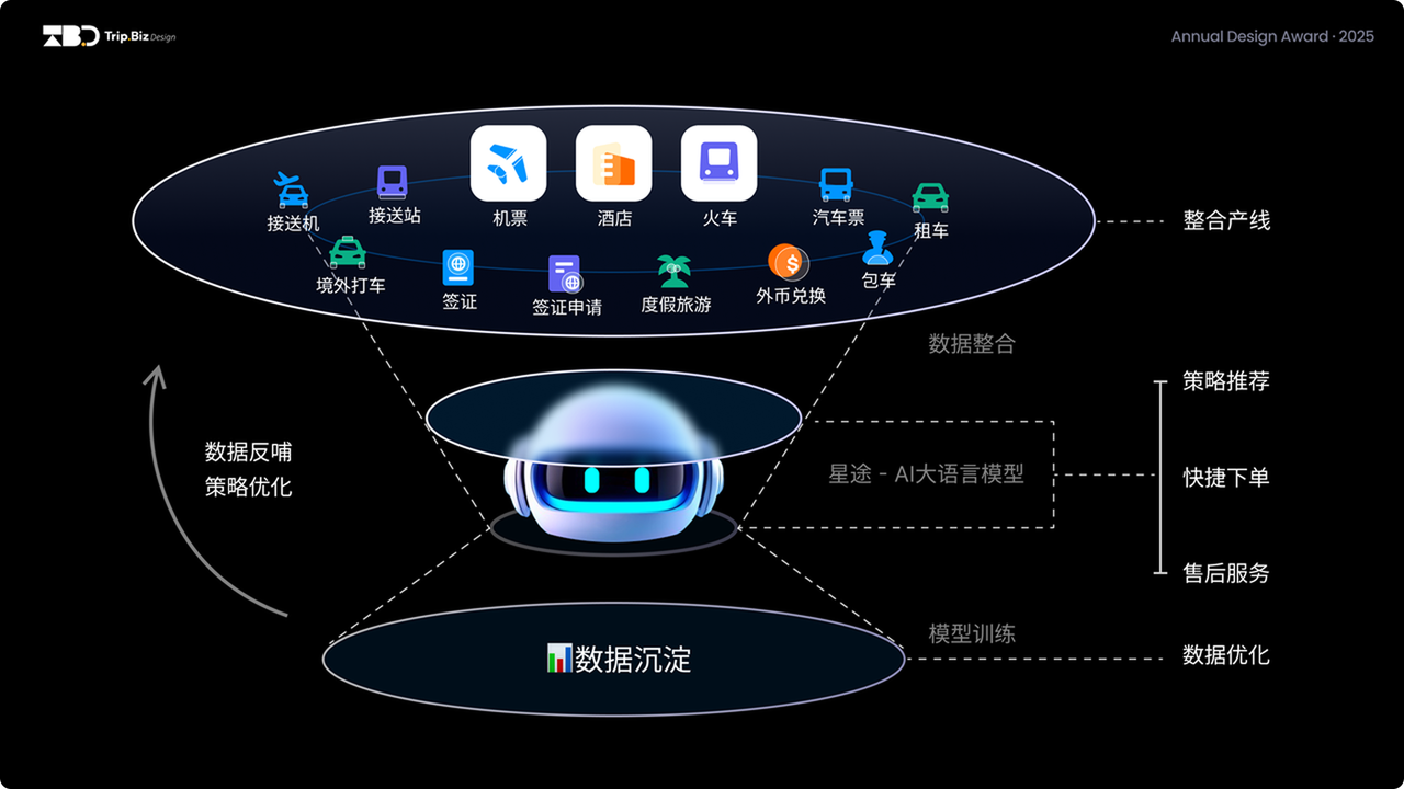 我们对用户差旅生命周期进行深度思考,按行前、行中、行后三大时间节点进行痛点拆解,最终推导出「体验智能 + 服务智能 + 数据智能」三位一体的程星途 AI,它不是三个抽象的技术概念,而是驱动我们从被动响应到主动服务,从标准化的展示范式到千人千面的个性化展示策略,从本质上来说就是用 AI 把 “麻烦的差旅” 变得 “省心”,既提升服务效率,让每一步体验都更贴近用户的真实需求。