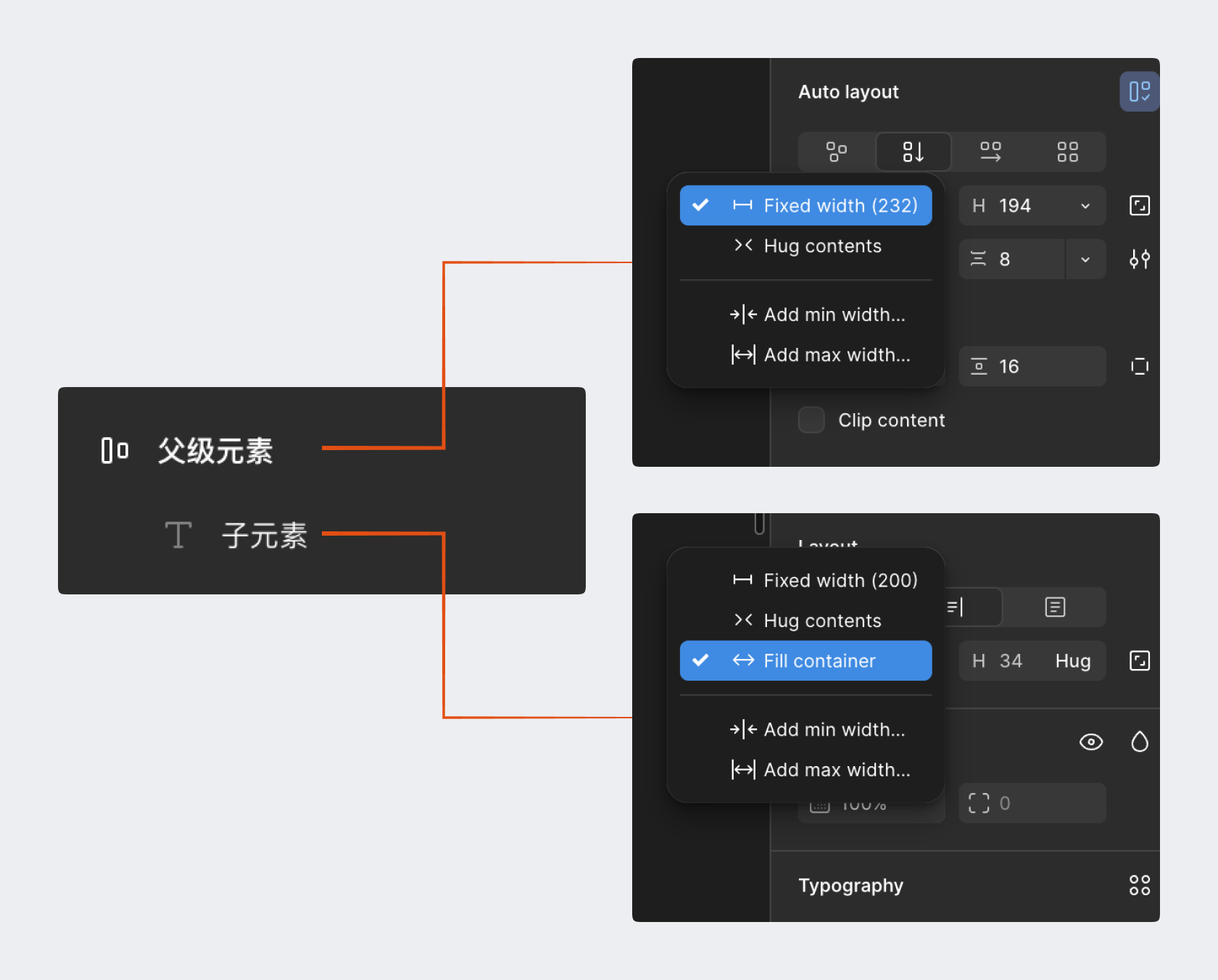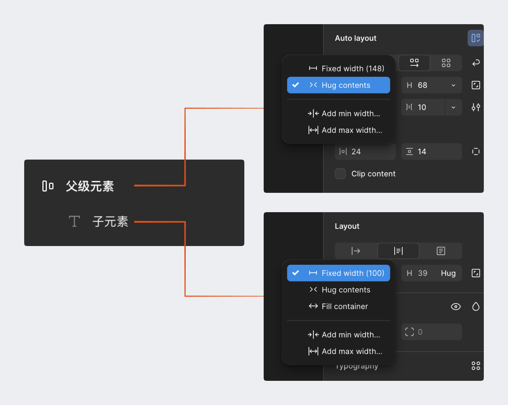 - 父编组 Hug / 子图层 Fixed:修改子图层尺寸,父级编组根据子图层自适应调节