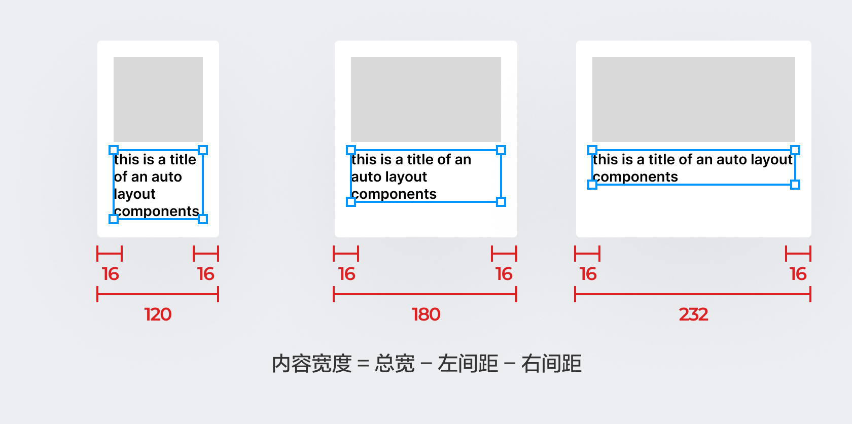 在这个模式下,布局编组的宽度是自适应的 Hug Contents,而子元素的宽度是固定的 Fixed。因为当父级宽度为自适应尺寸时,子元素就必须是具体的数值,才能得出最终得结果。